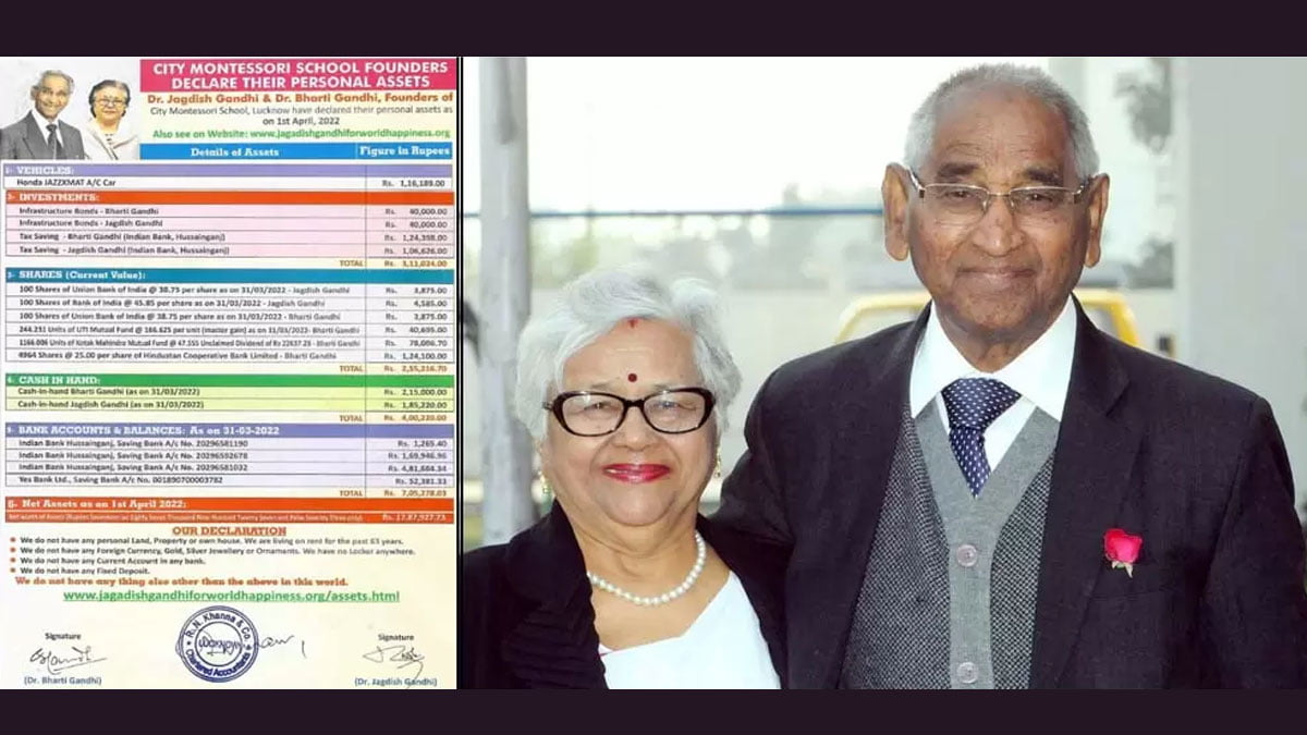 लखनऊ, 1 अप्रैल। पूर्व विधायक एवं सिटी मोन्टेसरी स्कूल (CMS), लखनऊ के संस्थापक डा. जगदीश गाँधी एवं उनकी पत्नी डा. भारती गाँधी ने अपनी व्यक्तिगत सम्पत्ति की घोषणा बेवसाइट www.jagdishgandhiforworldhappiness.org पर कर दी है। घोषित सम्पत्ति के अनुसार इन दोनों के पास कुल मिलाकर रू. 17,87,927/- (सत्तरह लाख सतासी हजार नौ सौ सत्ताइस रूपये) की सम्पत्ति है। डा. जगदीश गाँधी व डा. भारती गाँधी ने घोषित किया है कि उनके पास अचल सम्पत्ति के रूप में कुछ भी नहीं है। वे विगत 63 वर्षों से किराये पर रह रहे हैं। उनके पास अपना कोई व्यक्तिगत मकान नहीं है और न ही किसी प्रकार की जमीन व प्रापर्टी आदि है। किसी भी बैंक में उनका कोई फिक्स्ड डिपाजिट और लॉकर नहीं है और न ही किसी प्रकार की विदेशी मुद्रा, सोना, चांदी अथवा किसी प्रकार के आभूषण हैं। इसके अलावा, किसी भी बैंक में उनके नाम पर कोई चालू खाता (Current Account) नहीं है।